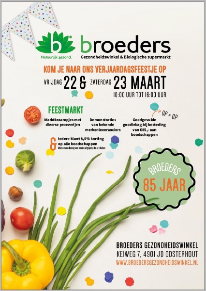 Op vrijdag 22 en zaterdag 23 maart is het verjaardagsfeest. Wie van hen die 85 kaarsjes uit gaat blazen weten we nog niet. “Maar als we hadden gewild zouden we bijkans 85 kraampjes van leveranciers hebben kunnen plaatsen, zoveel belangstelling was ervoor”, lacht Wim. “Maar dat kan natuurlijk niet, het worden er twee dagen x acht. Daarin demonstraties, proeverijen, aanbiedingen en kortingen natuurlijk en we stellen goodybags beschikbaar. Feest dus, op vrijdag en zaterdag van 10.00 tot 16.00 uur.”